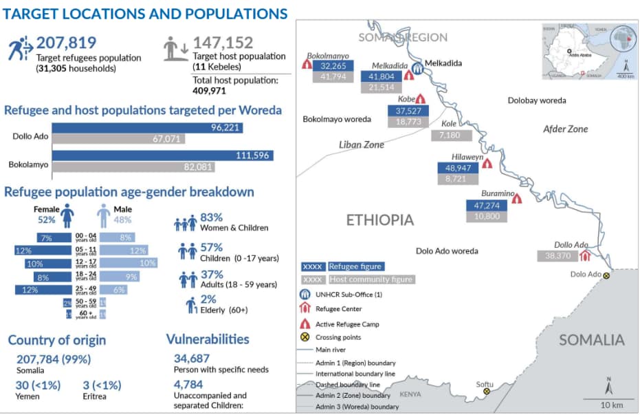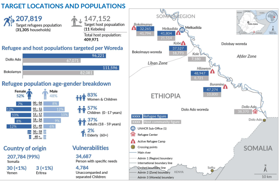 The Somali Region of Ethiopia hosts hundreds of thousands of Somali refugees fleeing political instability and conflict. These refugees cross the border into Ethiopia in search of security and humanitarian relief. Over the last ten years refugee settlements such as Melkadida, Bokolmayo, Kobe, Buramino and Helaweyn have been set up to absorb the growing numbers of refugees. Attracted to the facilities and infrastructure provided by humanitarian agencies, members of the host communities have also begun moving into these settlements. As the refugee and host population swells in size, the water supply and irrigation systems in these settlements are coming under increasing pressure.