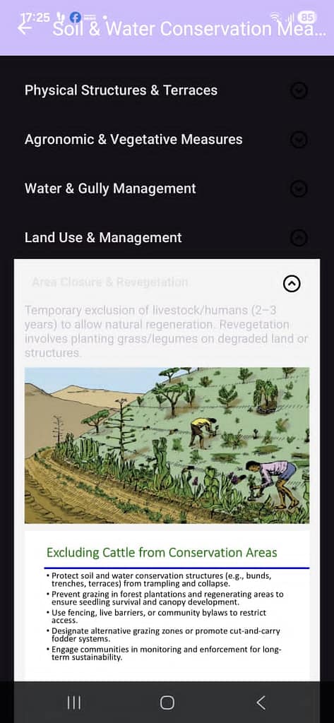 Unlike many digital decision-support tools that require reliable internet access or advanced technical skills, eLandCare is designed for day-to-day field use. It embeds Ethiopia’s national soil and water conservation guidelines directly into a simple workflow and allows users to move seamlessly from observation and assessment to recommendation without leaving the field.