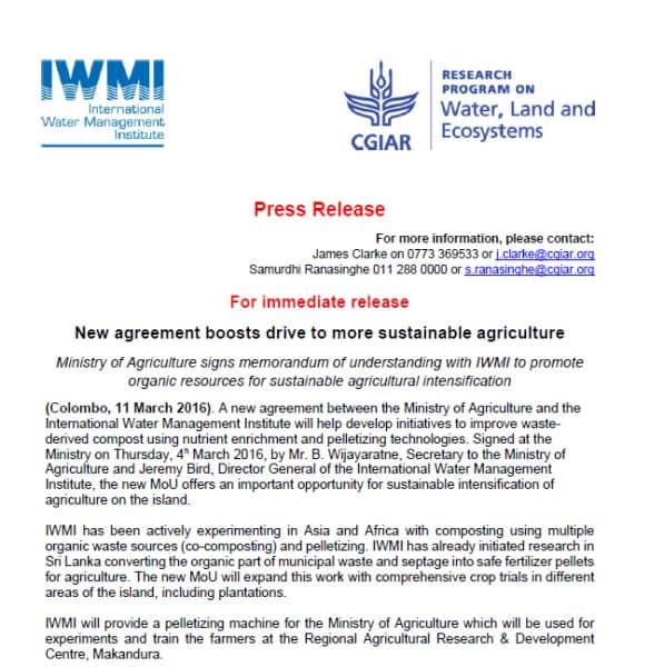 The International Water Management Institute (IWMI) is an international, research-for-development organization that works with governments, civil society and the private sector to solve water problems in developing countries and scale up solutions. Through partnership, IWMI combines research on the sustainable use of water and land resources, knowledge services and products with capacity strengthening, dialogue and policy analysis to support implementation of water management solutions for agriculture, ecosystems, climate change and inclusive economic growth. Headquartered in Colombo, Sri Lanka, IWMI is a CGIAR Research Center and leads the CGIAR Research Program on Water, Land and Ecosystems (WLE). www.iwmi.org