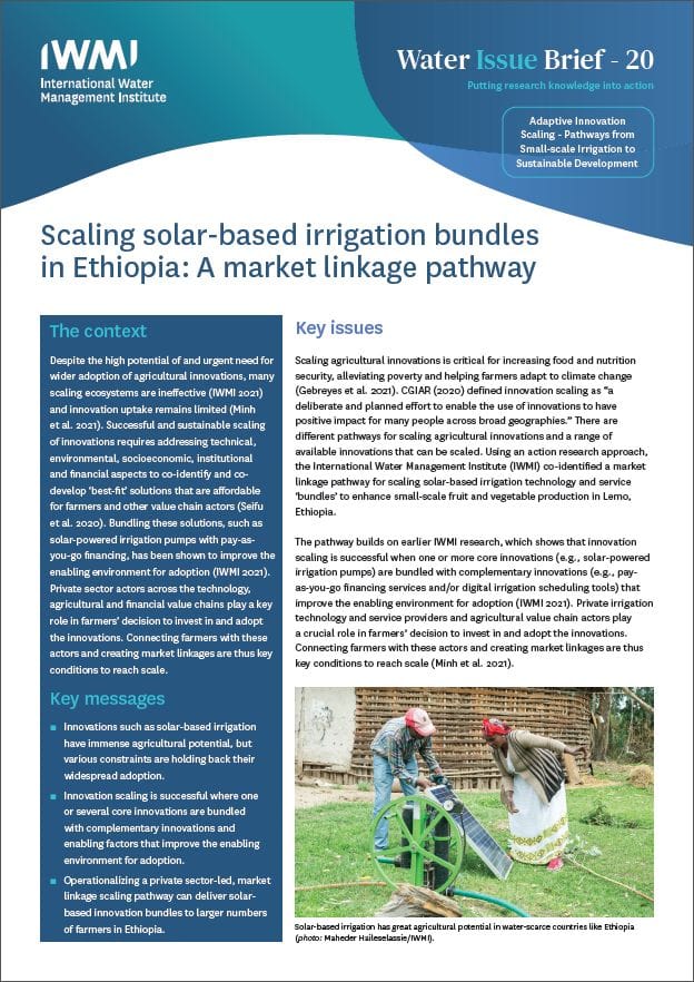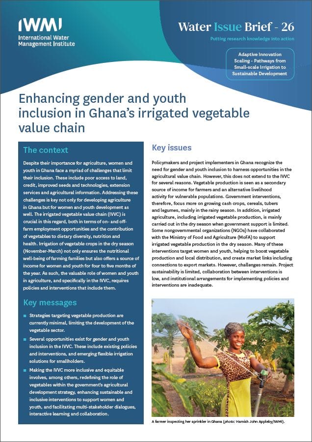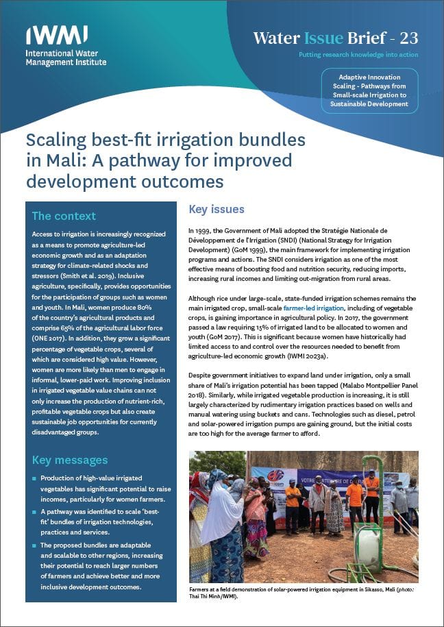 International Water Management Institute (IWMI). 2023. Inclusive agriculture: Creating opportunities for women and youth in Mali’s irrigated vegetable value chain. Adaptive Innovation Scaling – Pathways from Small-scale Irrigation to Sustainable Development. Colombo, Sri Lanka: International Water Management Institute (IWMI). 8p. (IWMI Water Issue Brief 21). [doi: https://doi.org/10.5337/2022.228]