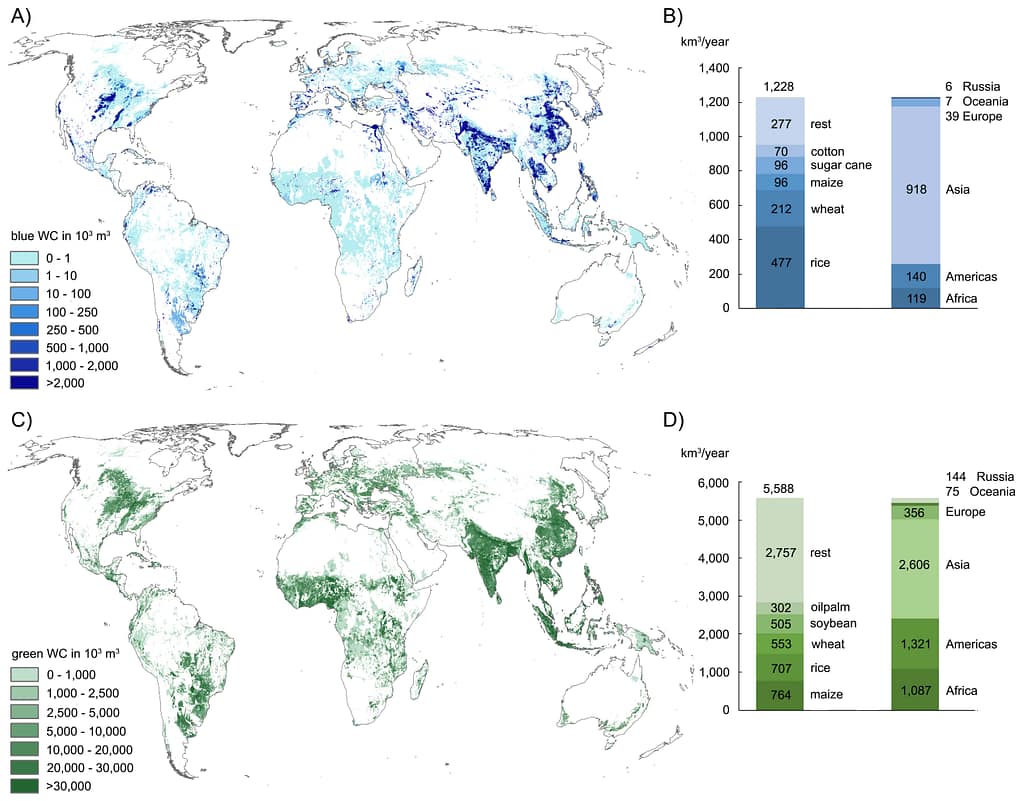 The researchers also calculated the global blue and green water consumption for the years 2000 and 2010, based on SPAM datasets from those years, to evaluate the change in crop water consumption up to 2020.